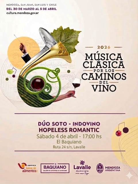 01/04/2026 | Lavalle será parte de la XXVI edición del festival Música Clásica por los Caminos del Vino, uno de los encuentros culturales más importantes de la provincia, que se hará del 30 de marzo al 5 de abril en el marco de Semana Santa.